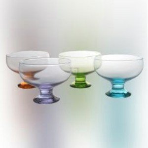Perfectly suited for desserts, these fun dishes feature colorful bases and low, wide bowls that are the perfect shape for ice cream, parfaits, fresh fruit and more to bring a bit of the good life to your desserts. Each of the glass bowls are a different color in orange, purple, blue and green.