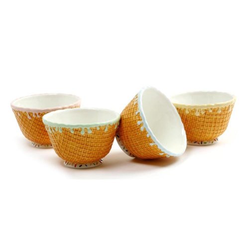 Fun and whimsical waffle cone design ice cream bowls, each with a different color border. Capacity: approximately 2 cups/16 ounces each. Dishwasher safe.